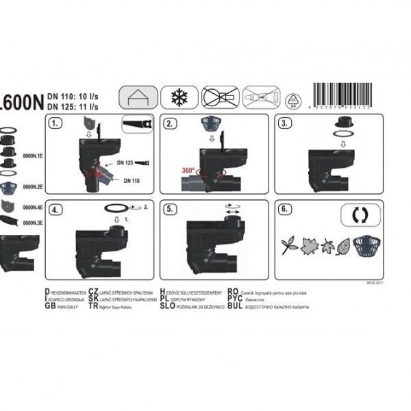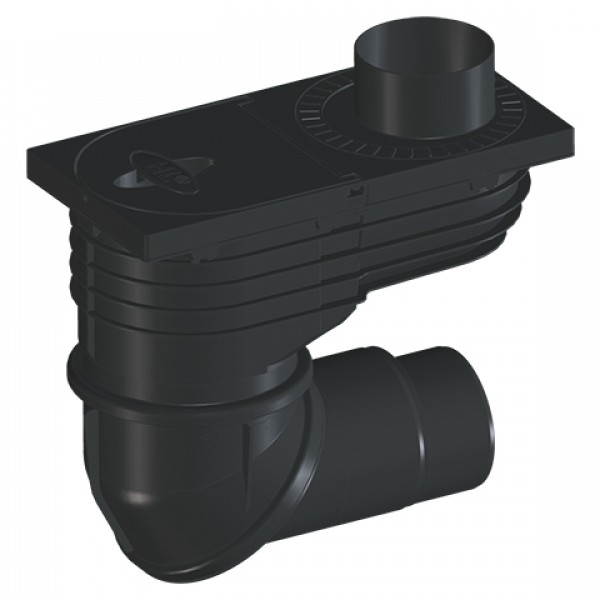 Уличный трап для приема воды из наружных ливнестоков DN110/125 с поворотным шарниром, с морозоустойчивым запахозапирающим устройством, листвоуловителем, с лючком-прочисткой, с переходником для подсоединения к водосточной трубе.