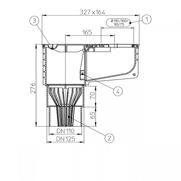 Минимакс-уличный трап для наружного приема воды из ливнестоков DN110/125 с морозоустойчивым запахозапирающим устройством, лючком для прочистки, листвоуловителем и наборными кольцами ? 75 - 110 мм