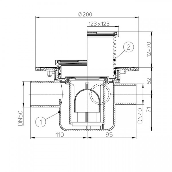 Трап для внутренних помещений DN50 горизонтальный с обжимным фланцем, с запахозапирающим вкладышем с обратным клапаном, с 3-мя отверстиями расположенными сбоку DN40, со снимаемыми насадными подрамниками 12 - 70мм / 123 х 123мм и решеткой из нержавеющей стали 115 х 115мм, опорными рамами. Строительная защита во время монтажа в комплекте.
