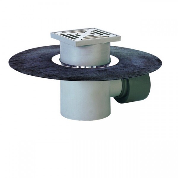Трап для внутренних помещений DN75/110 горизонтальный с приварным битумным полотном ? 500мм, со снимаемыми насадными подрамниками 20 - 70мм / 147 х 147мм, решеткой из нержавеющей стали 138 х 138мм, песколовкой, запахозапирающим вкладышем, прочисткой. Высота запахозапирающего устройства: 60мм. Строительная защита во время монтажа в комплекте.