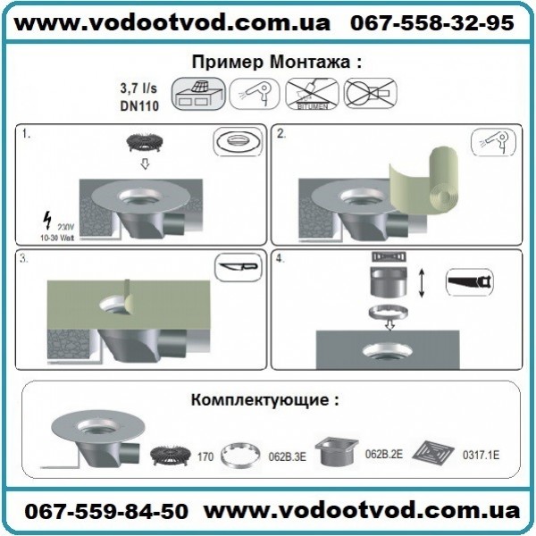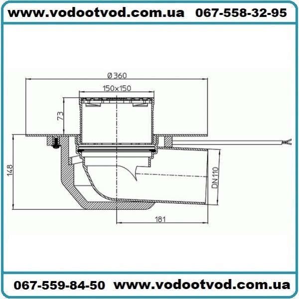 Кровельная воронка для эксплуатируемой кровли, горизонтальный выпуск, с теплоизоляцией, с электрообогревом от сети напряжением 230В, мощностью 10-30Вт, с ПП-фланцем для приварки кровельного изолирующего полотна FPO (эластичный полиолефин) на основе ПП, с надставным элементом 20-75 мм (подрамник 148 х 148 мм/решётка из нержавеющей стали 137 х 137 мм). Строительная заглушка в комплекте.