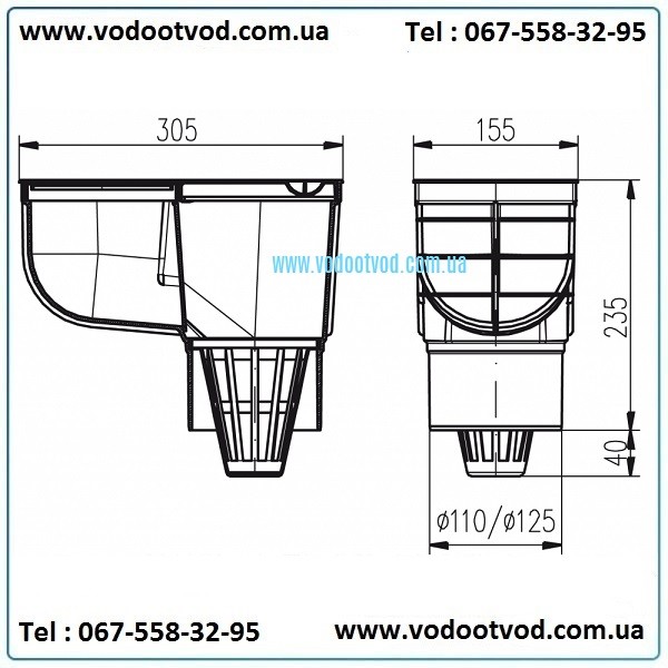 Дождеприемники МСН предназначены для отвода воды с водосточной трубы к канализации. Универсальное кольцо позволяет подключать к дождеприемникам трубы различных диаметров - 75, 80, 90, 100, 110 или 125 мм. Вертикальное подключение к канализации имеет стандартный диаметр 110 мм. Дождеприемники имеет сухой клапан для блокировки запахов канализации и корзинку для улавливания мусора и предупреждения засорения канализации. Дождеприемники произведены из УФ-стабилизированного полипропилена и устойчивы к погодным условиям.