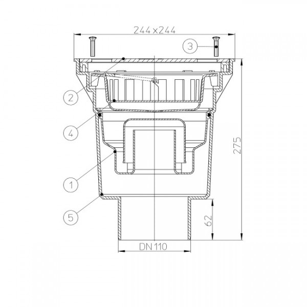 Дворовый трап серии Perfekt DN110 вертикальный с подрамниками из ПП 244 х 244мм, с песколовкой и гидравлическим (водяным) сифоном.