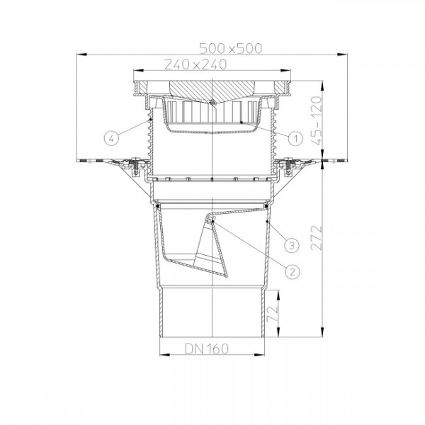 Дворовый трап серии Perfekt вертикальный с приваренным битумным полотном 500мм, в качестве идеального соединения к битумным уплотнениям, со снимаемыми насадными подрамниками из ПП 42 - 130мм / 240 х 240мм, песколовкой и морозоустойчивым запахозапирающим устройством.