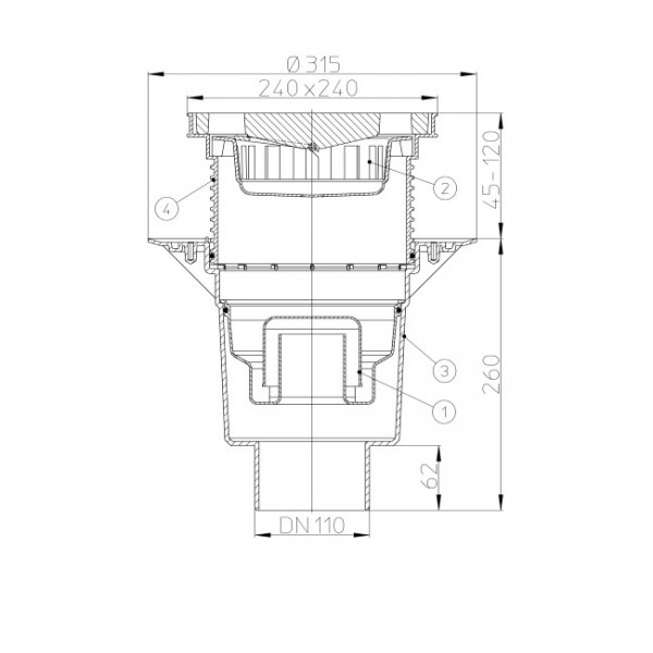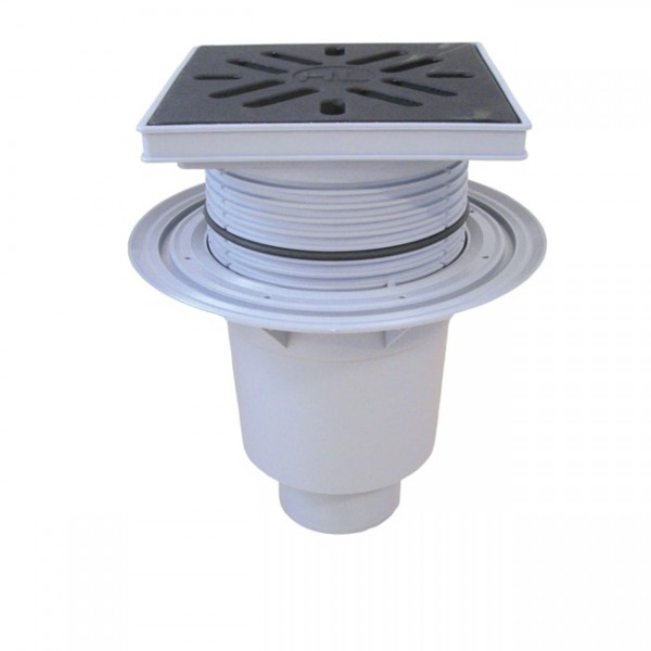 Дворовый трап серии Perfekt вертикальный с обжимным фланцем, со снимаемыми насадными подрамниками из ПП 42 - 130мм / 240 х 240мм, песколовкой и водяным затвором.